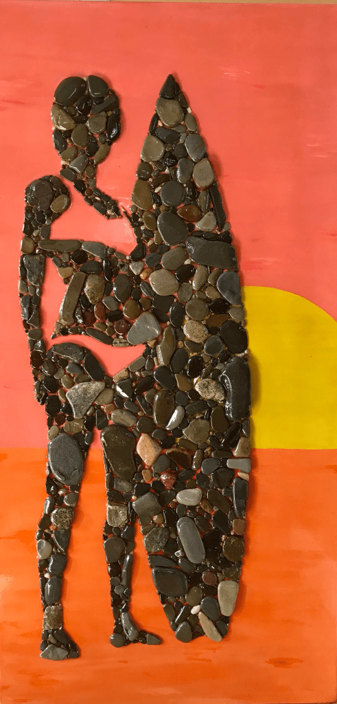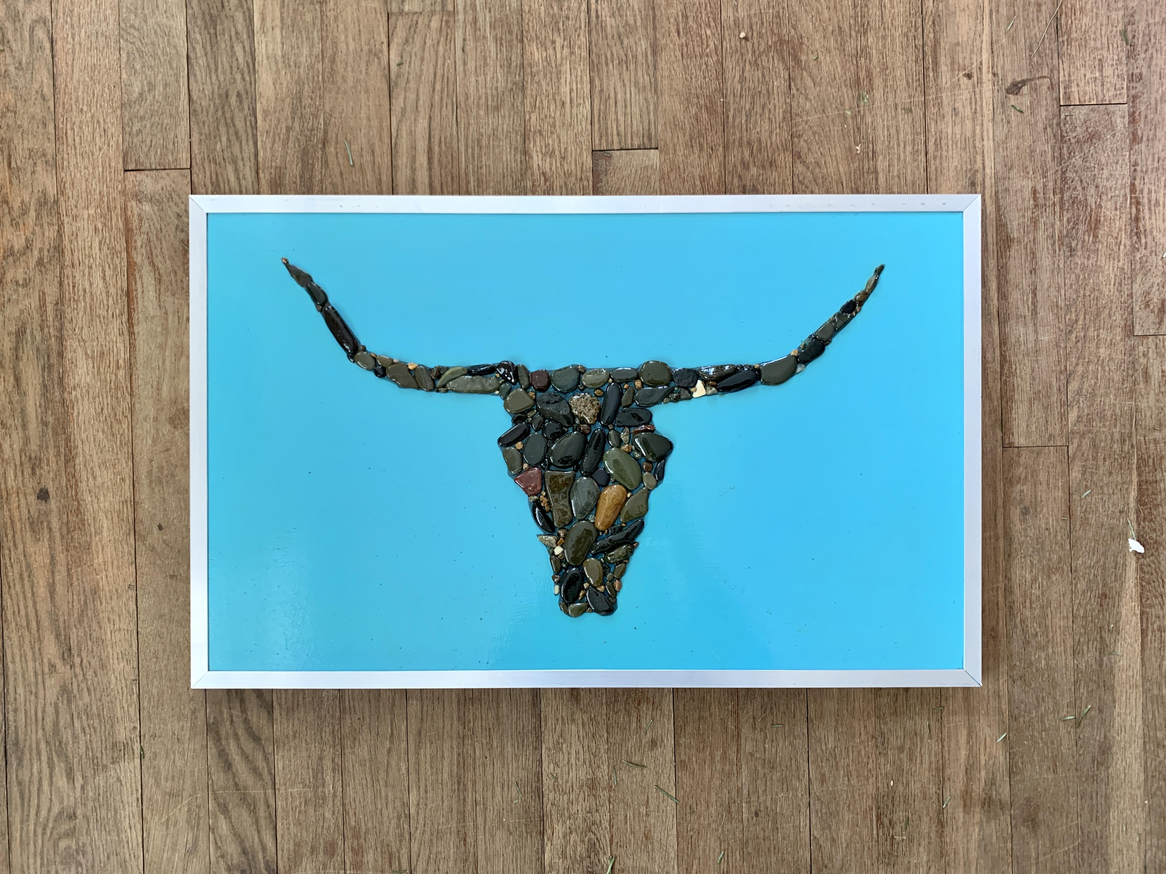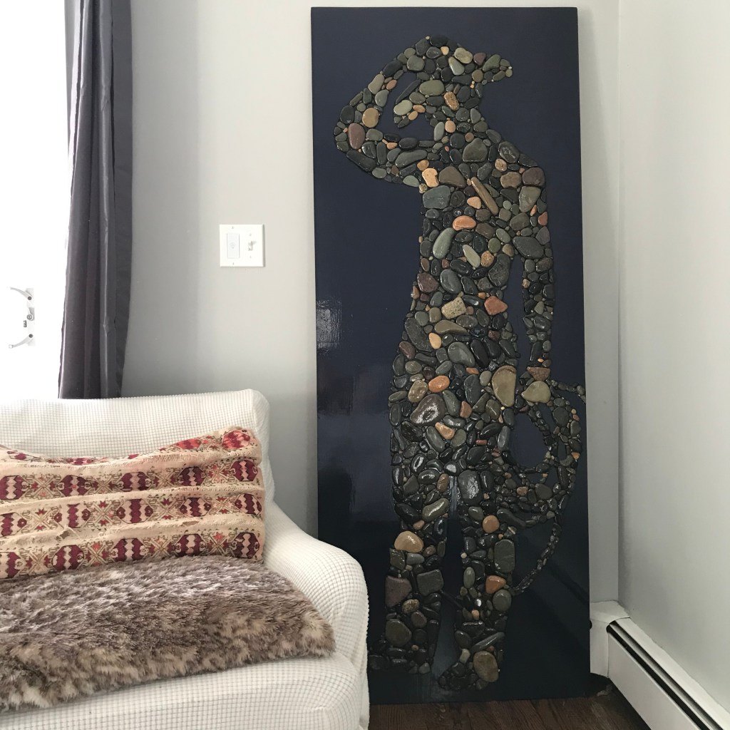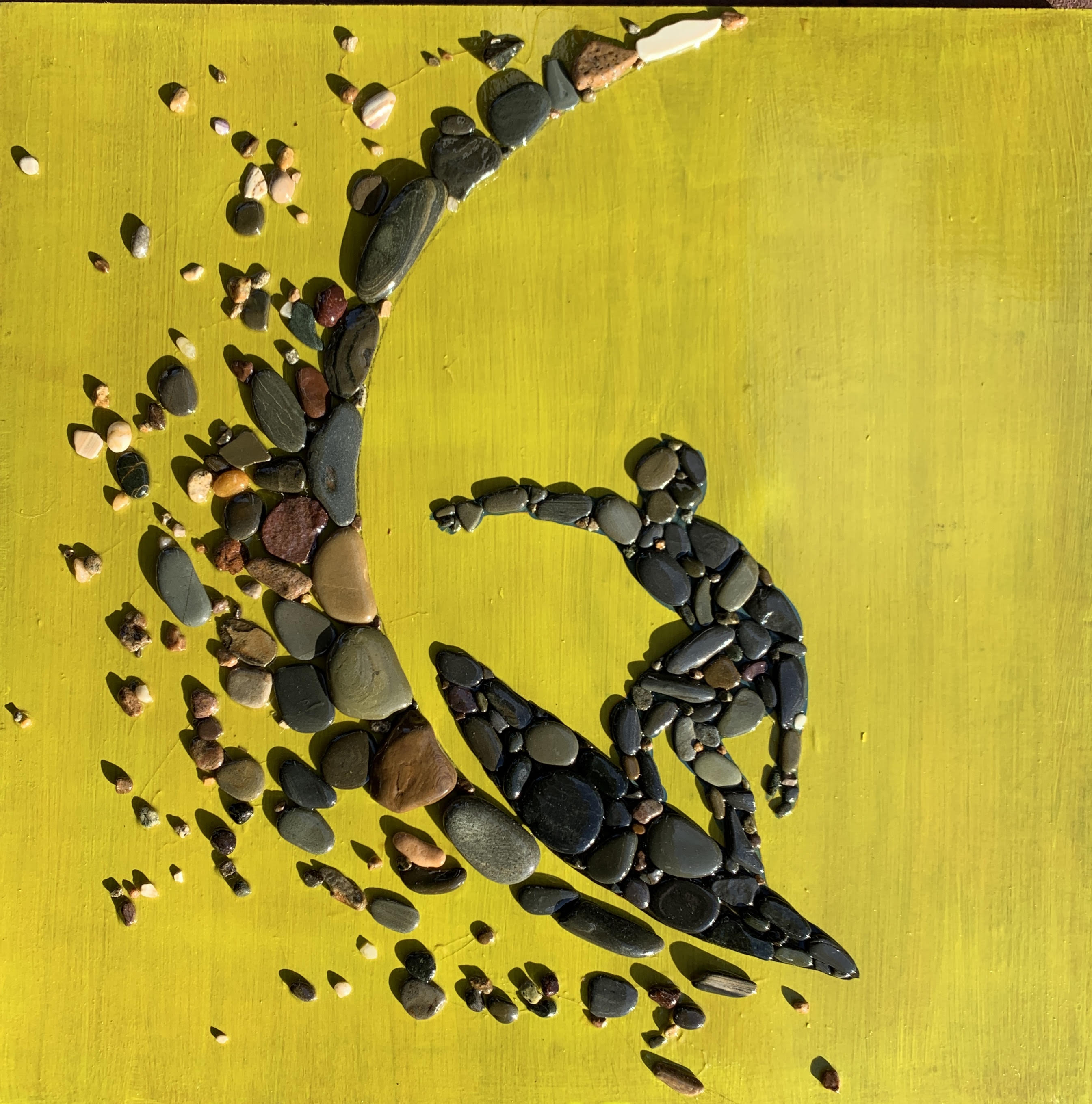 The simple joy of collecting stones has turned into a passion for creating large and original stone silhouettes on wood. Using flat stones collected at the head of the harbor in Nantucket I paint boards with house paint, draw out a silhouette, epoxy the stones on and then lather on several layers of polyurethane.